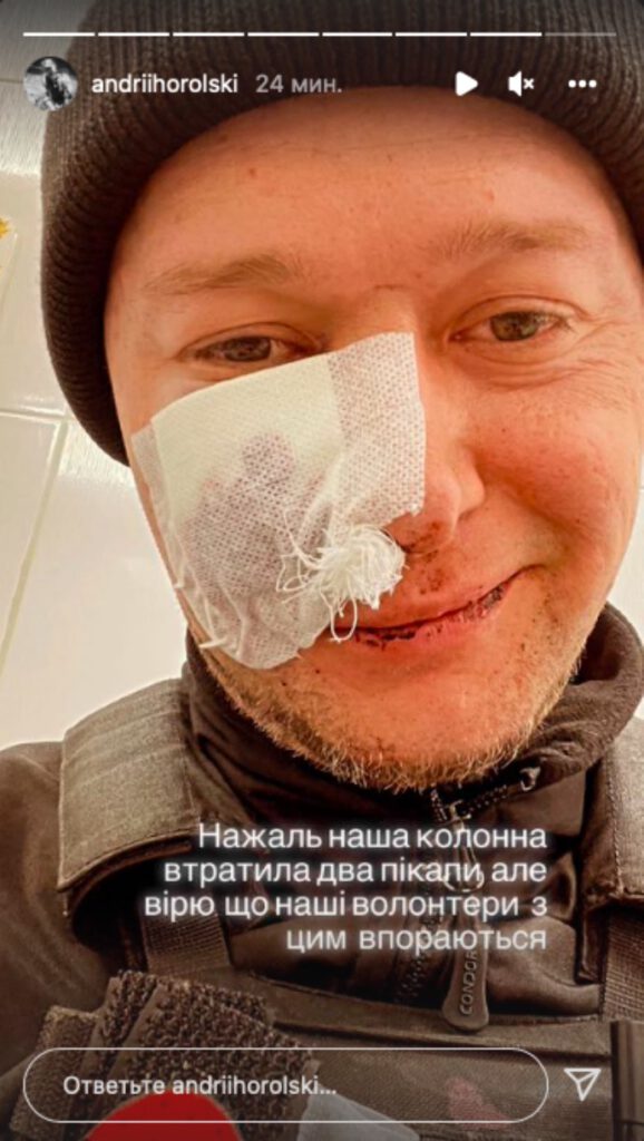 Лідер гурту «Бумбокс» отримав поранення обличчя. За словами Андрія Хливнюка, його колона втратила два пікапи, однак він надіється, що волонтери впораються з цим.