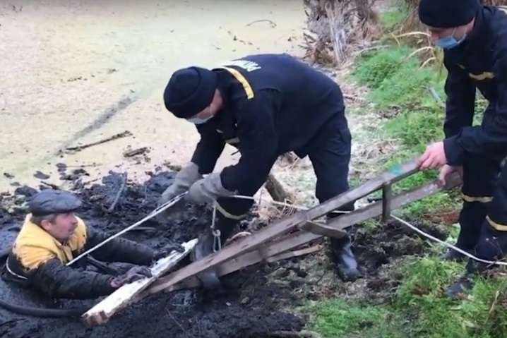 Працівники ДСНС завдяки спеціальному спорядженню витягнули бідолашного з болота. Від госпіталізації чоловік відмовився.